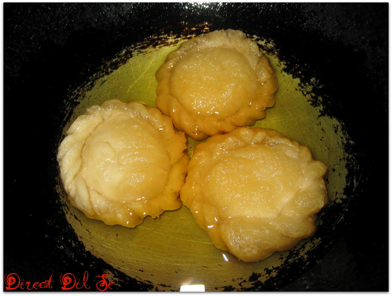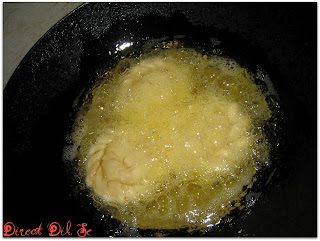 9.Heat the oil till it reaches the correct stage.To check for the correct stage,just add a pinch of the dough.If it rises up immediately,then that is it.Perfect!!!Add 2-3 badushas in the oil and immediately switch off the gas stove.